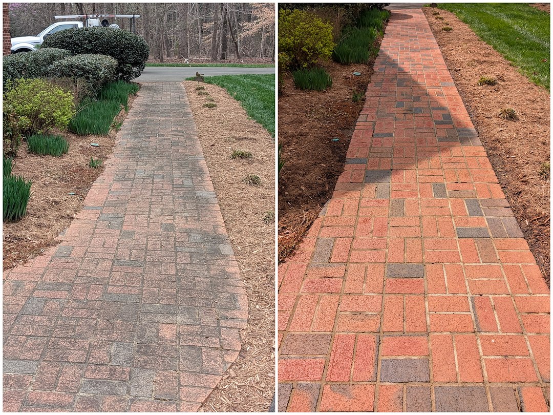 This Efland NC homeowner reached out to Berx Exterior Cleaning when she realized it was time to clean up some of those outdoor spaces for the upcoming Spring and Summer seasons. We made a trip out to the property and walked the property with the homeowner so she could point out her concern areas. We explained our process and ultimately decided on cleaning the house, deck cleaning, as well as all brick patios and walkways. Brick wall, walkway, and patio cleaning is so satisfying as years of grime and organic growth cover such beauty and were the ones that get to make it look new again!