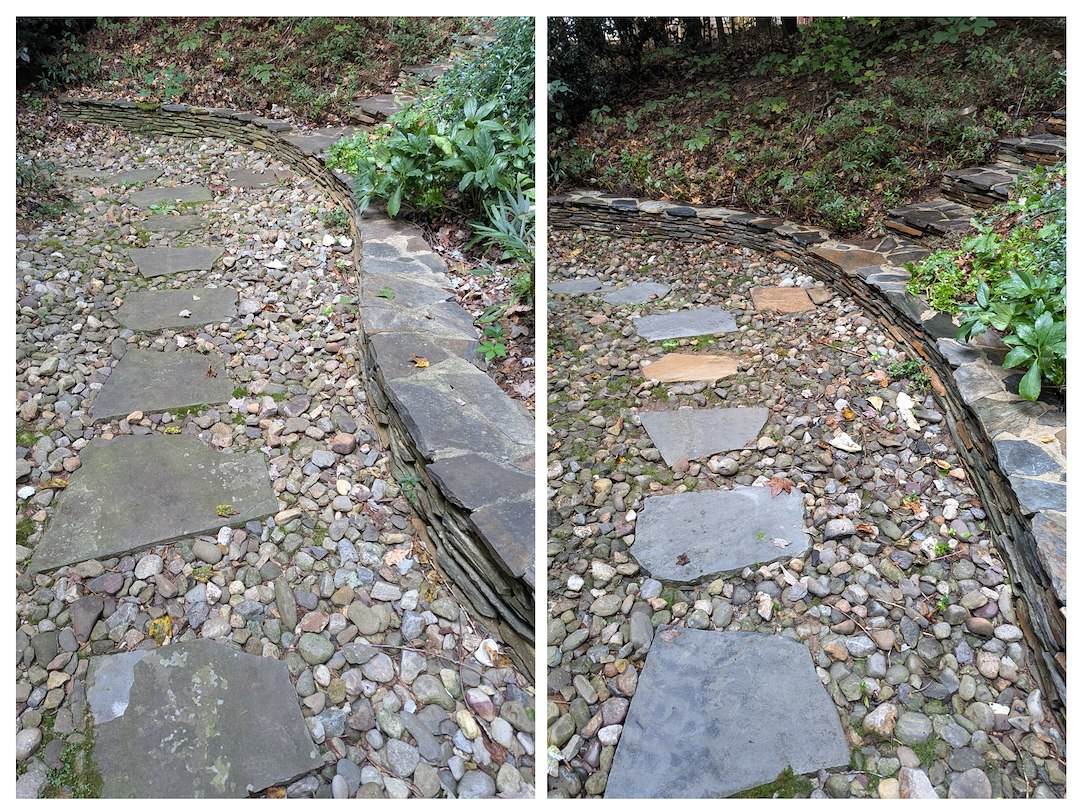 This Hillsborough homeowner contacted us with an urgent request for patio cleaning, sidewalks, retaining walls, and exterior windows in preparation for an upcoming event. Thankfully we were able to shuffle the schedule and make it happen fairly quickly. These flagstone pavers and walls were great and drab but, by removing all of that dirt and organic growth, those beautiful colors are now shining once again! The homeowner was returning from a walk as the job was being completed and commented that the windows "looked as if they were sparkling" from the street. That's what we love to hear!