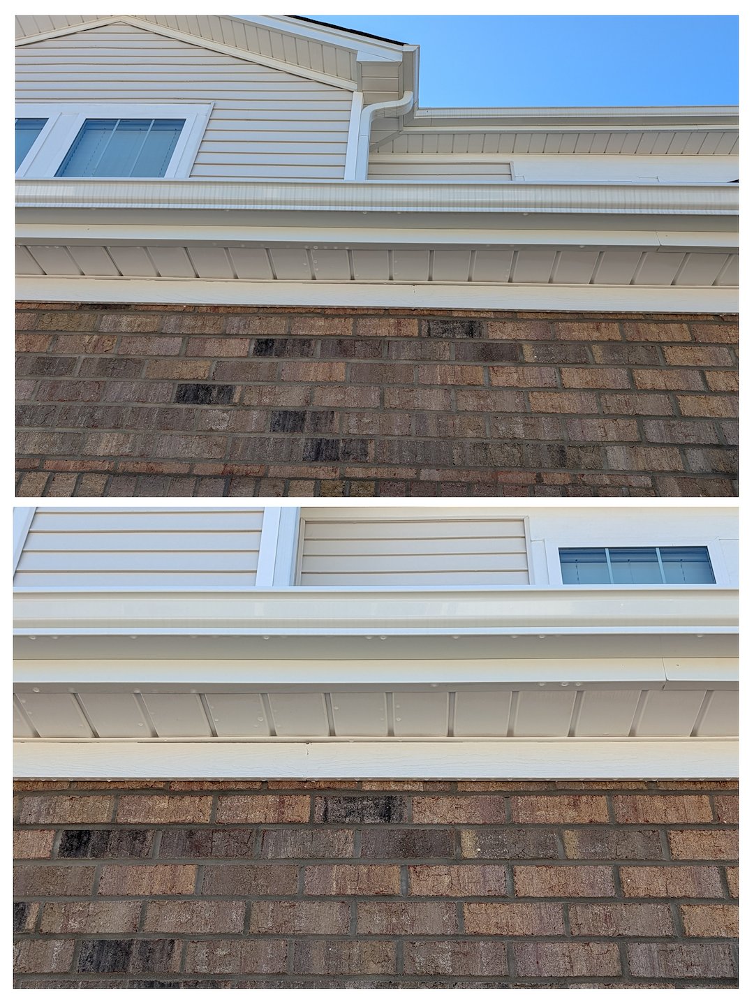 This Mebane, NC homeowner contacted Berx Exterior Cleaning requesting a house powerwash, driveway cleaning, and patio cleaning. Upon arrival, we also observed gutter oxidation, commonly referred to as tiger striping. Thankfully, we carry what we need for most house wash situations. After a discussion with the homeowner, we used a specialized chemical to remove this striping from the gutters after the house washing had been completed. As always, steps were taken to protect plants, which in this case required tarp covering while using this chemical on the gutters. This home is now sparkling from the gutters to the concrete!